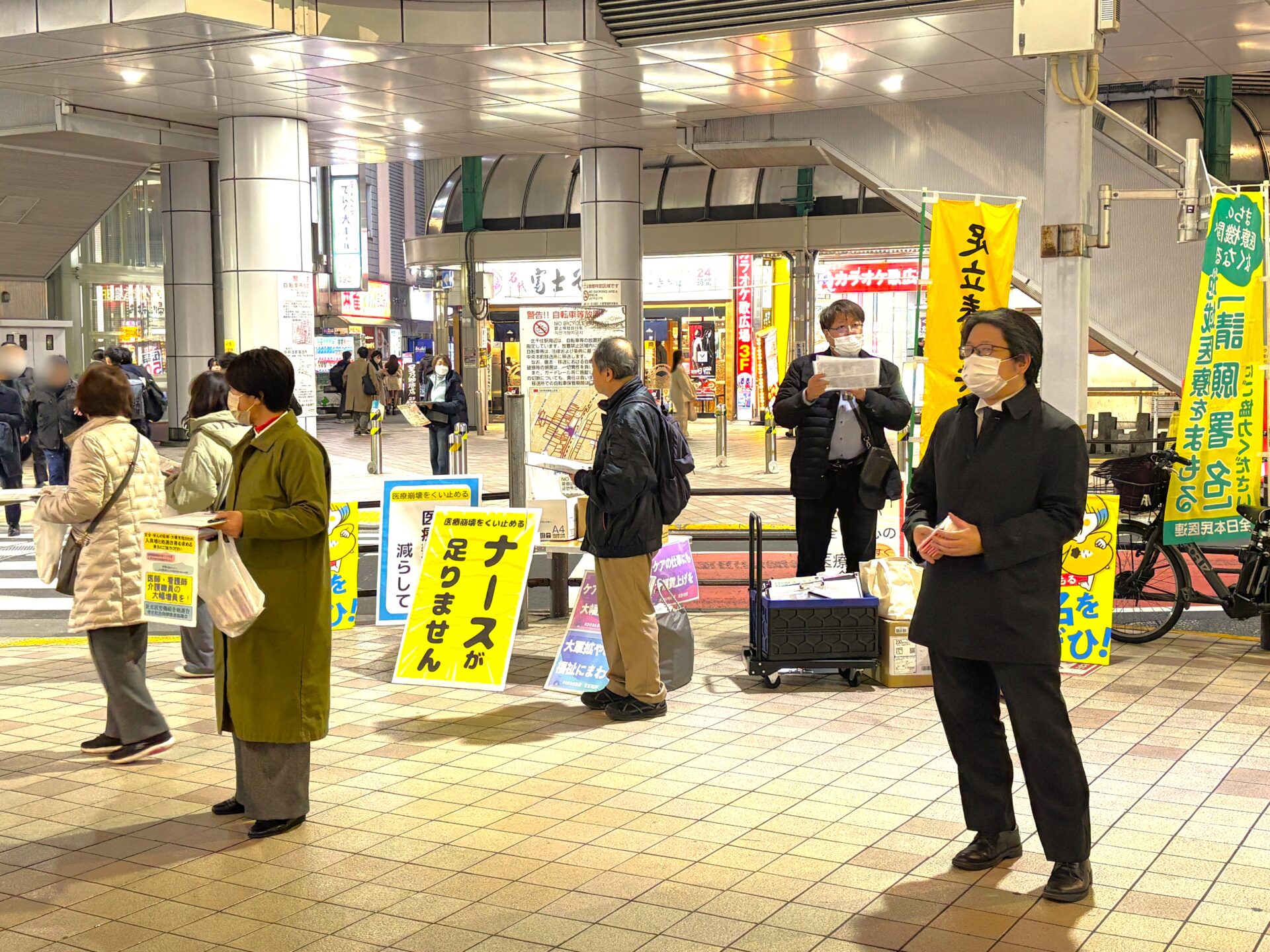 足立区の北千住駅前で「医療介護崩壊をくい止める宣伝行動」を行いました