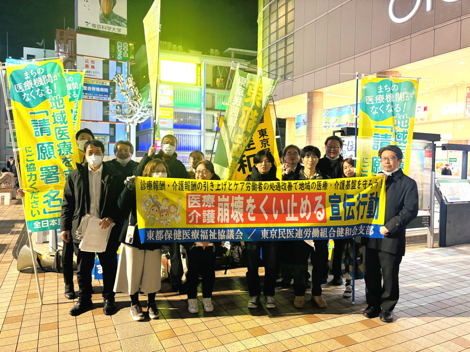 足立区の北千住駅前で「医療介護崩壊をくい止める宣伝行動」を行いました