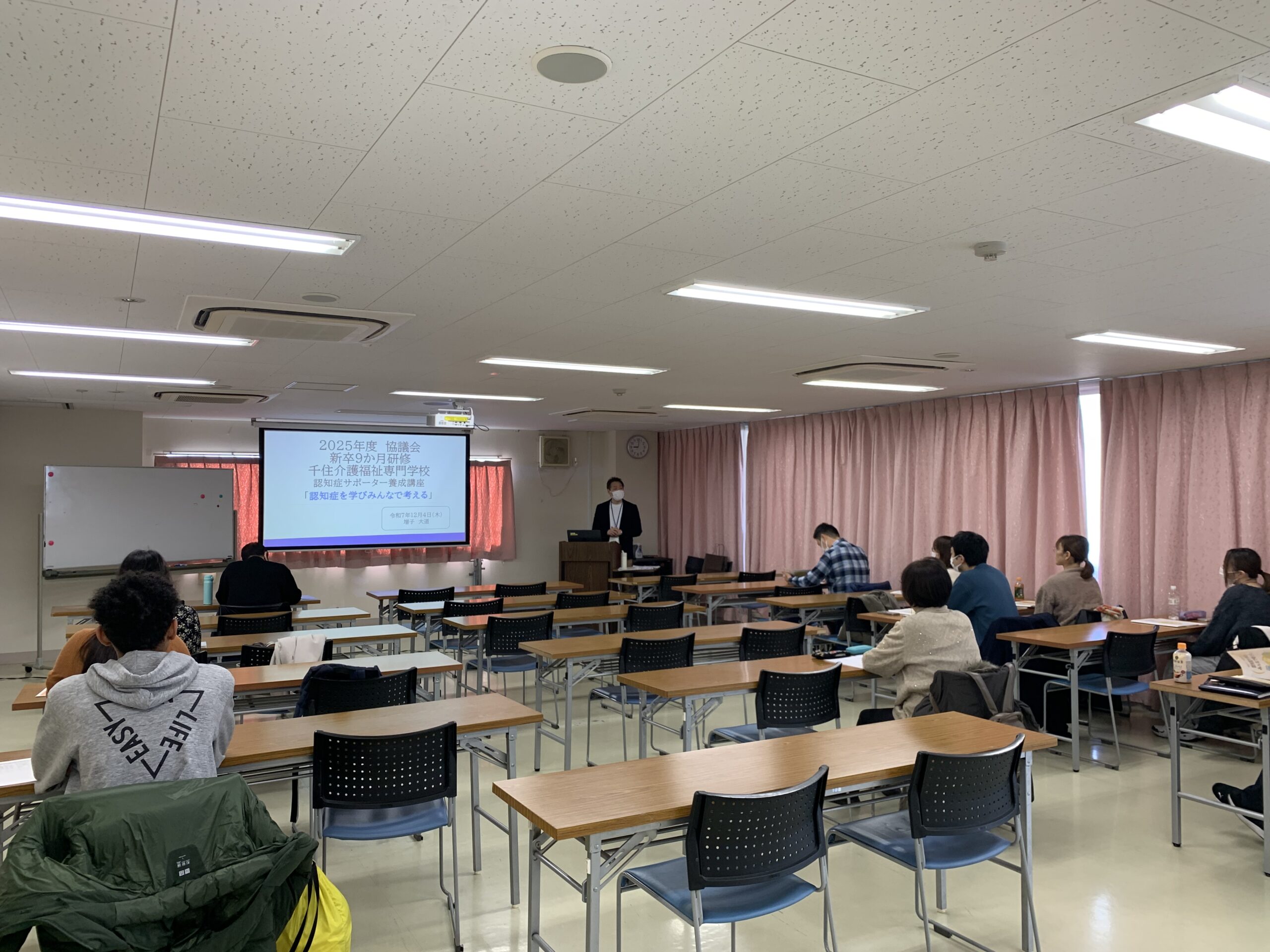 12月4日、千住介護福祉専門学校で協議会新入介護職員9カ月研修(就業促進事業入職職員を含む)を実施し、9人の介護職員が参加しました。